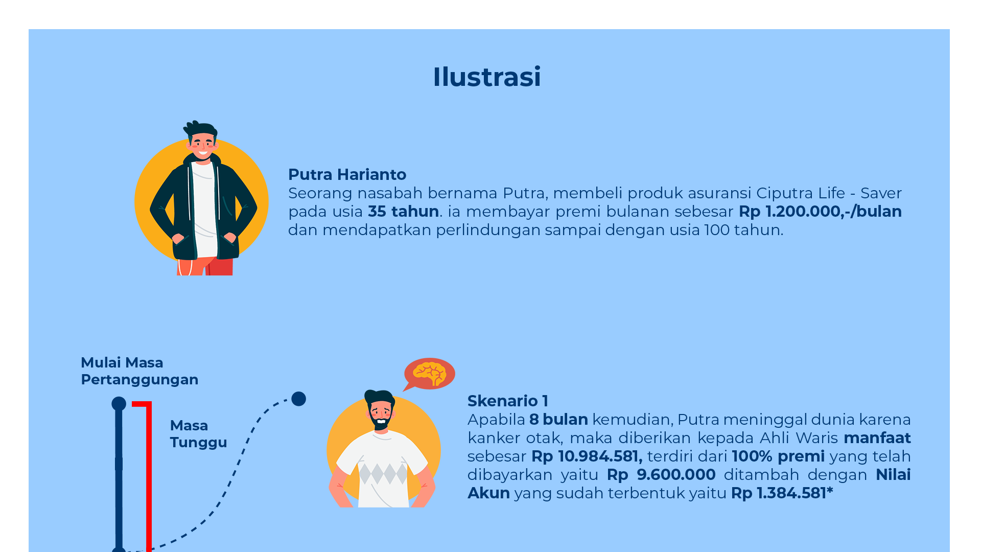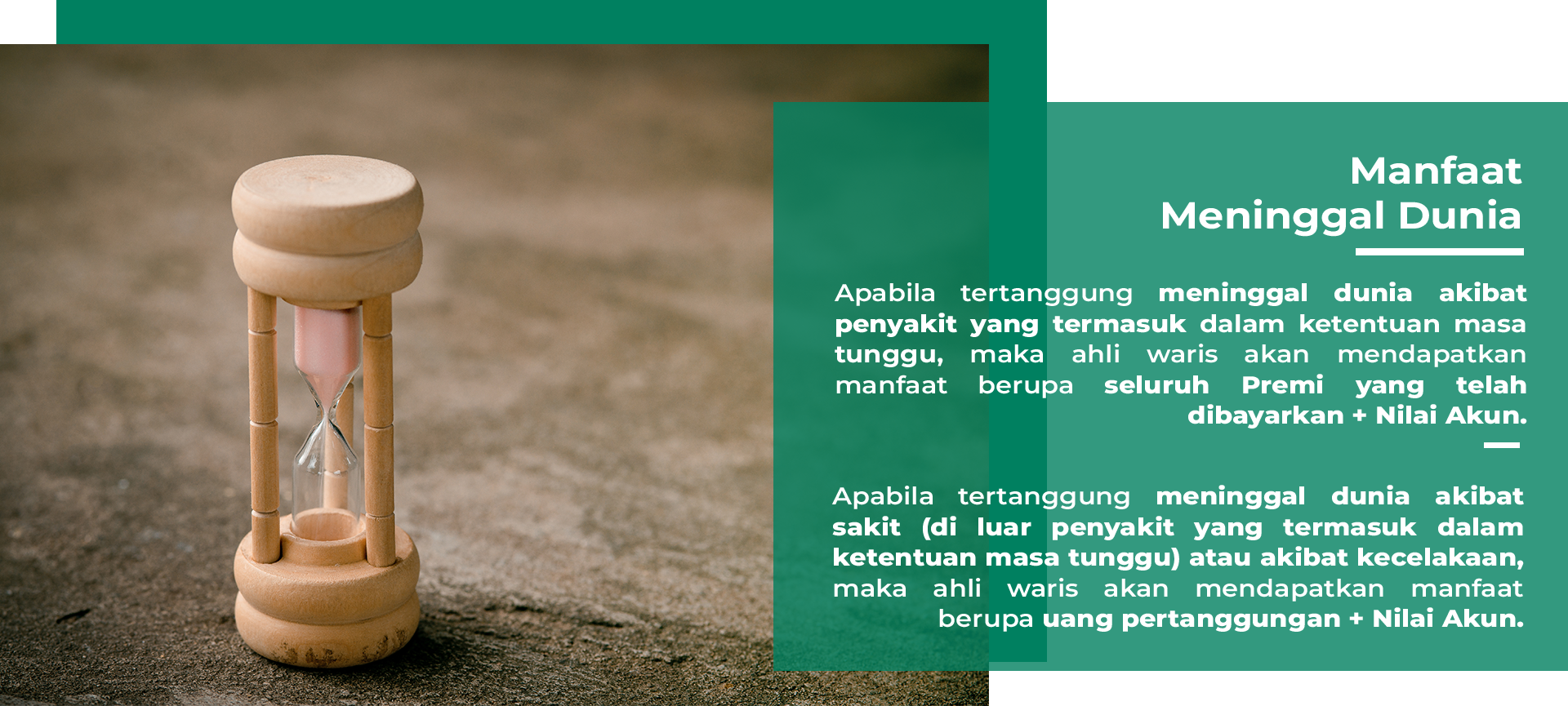 Masa Tunggu adalah jangka waktu 1 (satu) tahun kalender sejak berlakunya Polis asuransi. Apabila Tertanggung meninggal dunia dalam masa tunggu akibat penyakit dibawah ini, maka akan mendapatkan manfaat pengembalian seluruh Premi yang telah dibayarkan + Nilai akun.