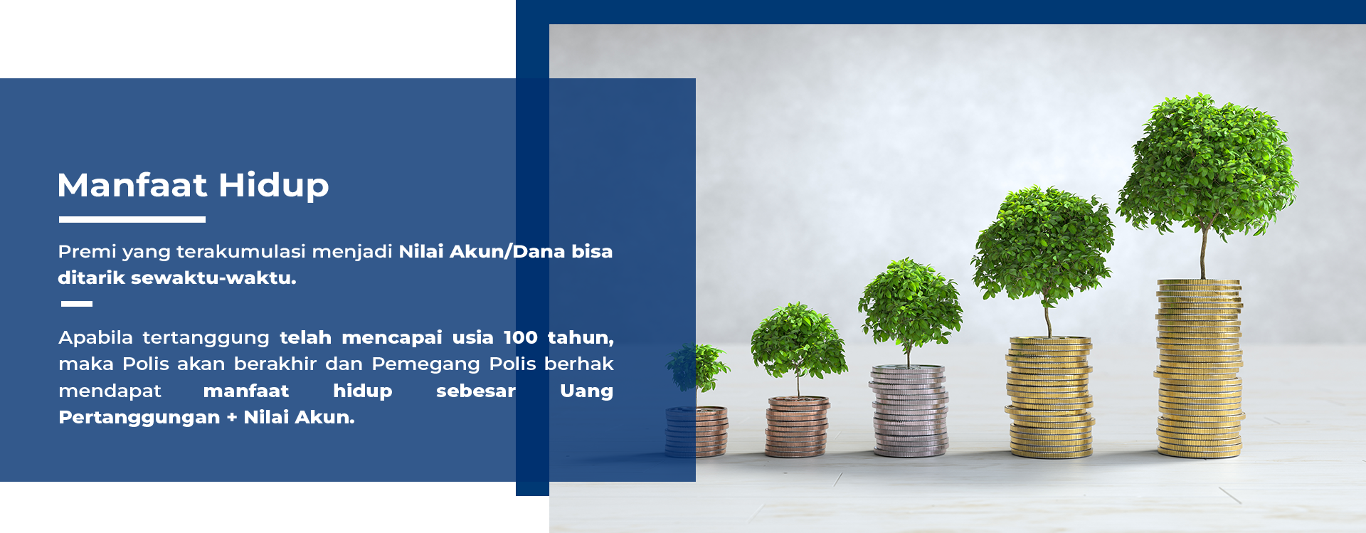 Merupakan produk asuransi pertama dan satu - satunya di Indonesia yang memberikan perlindungan seumur hidup dengan nilai pengembangan atas alokasi Premi yang dijamin selalu positif serta bisa ditarik kapan saja.