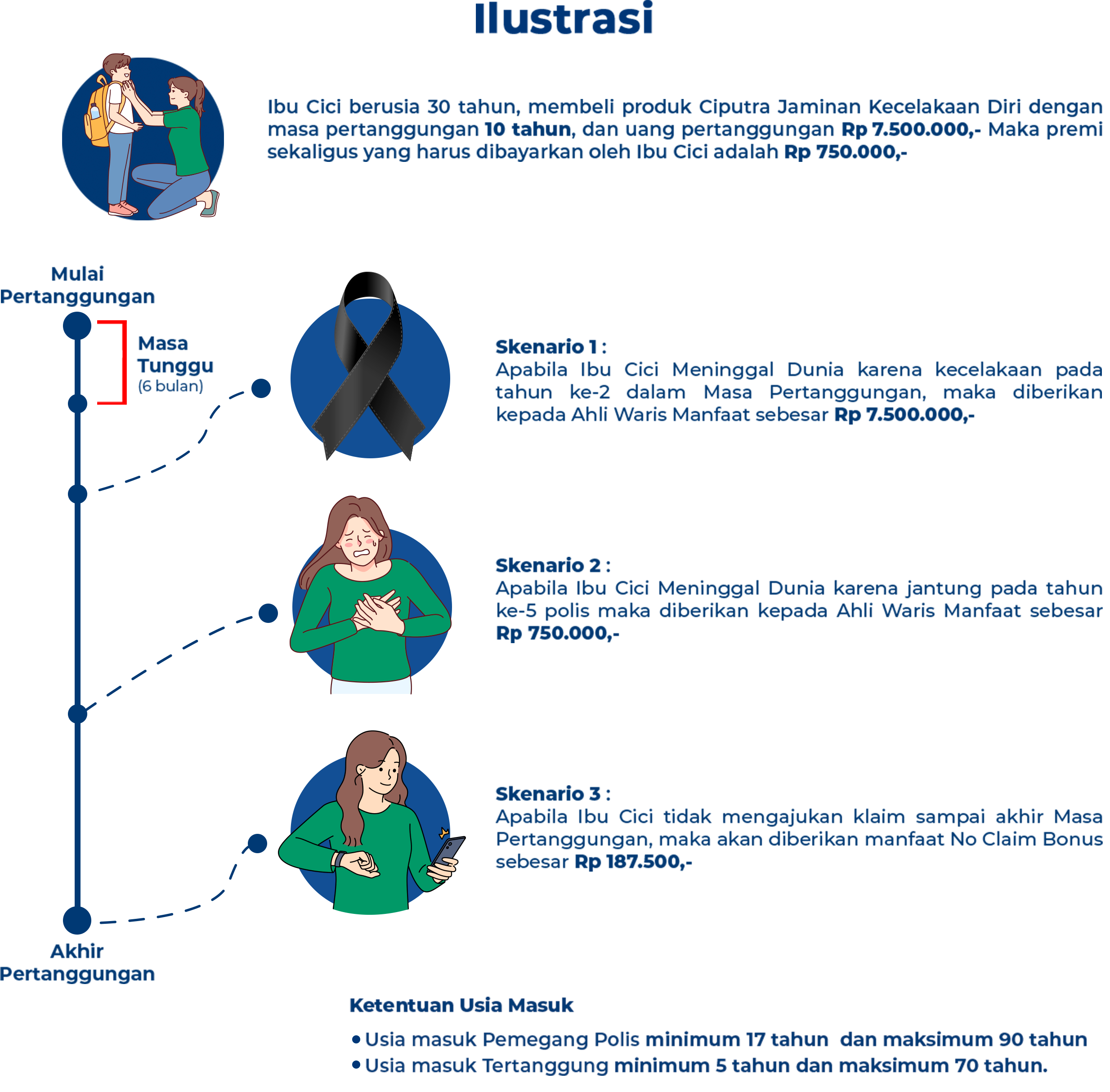 Manfaat Meninggal Dunia karena sebab alami, sakit atau penyakit setelah melewati Masa Tunggu santunan duka sebesar 1x Premi yang telah dibayarkan