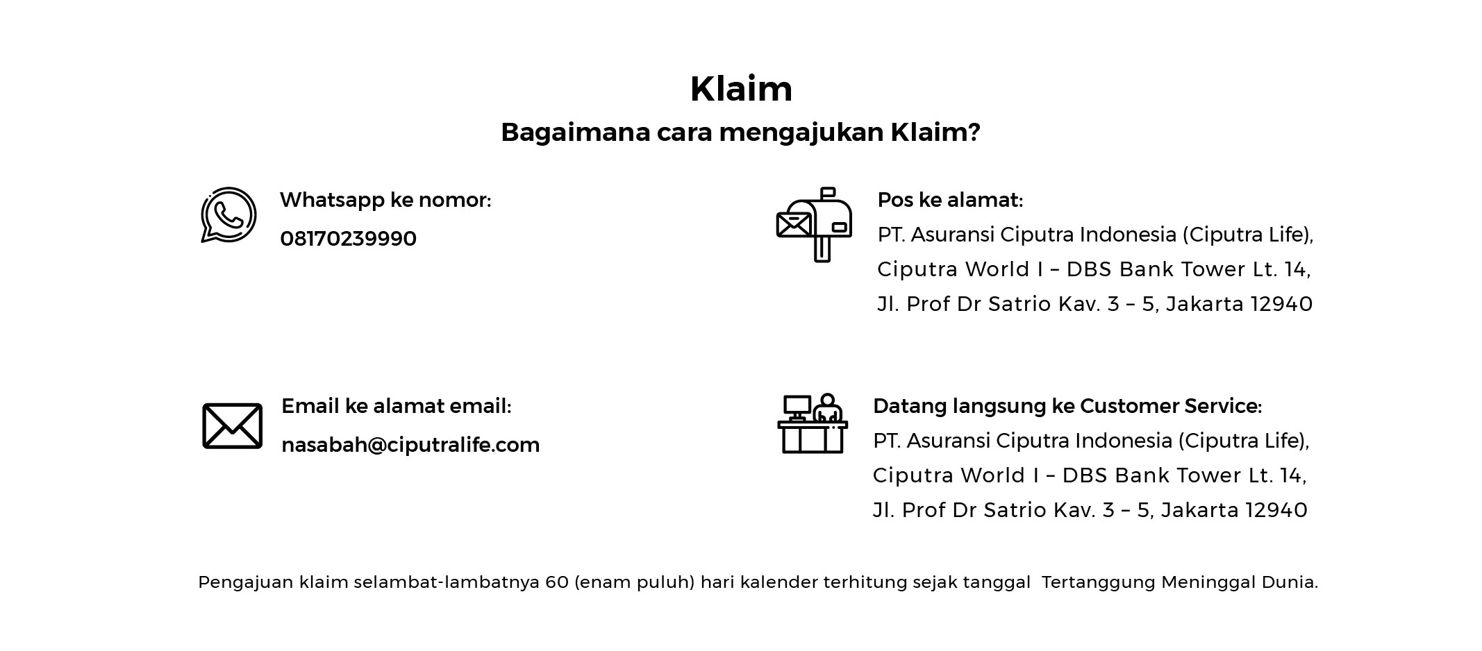 Kontak Ciputra Life 1500239, WA 0817 0239 990 atau Email ke [email protected]