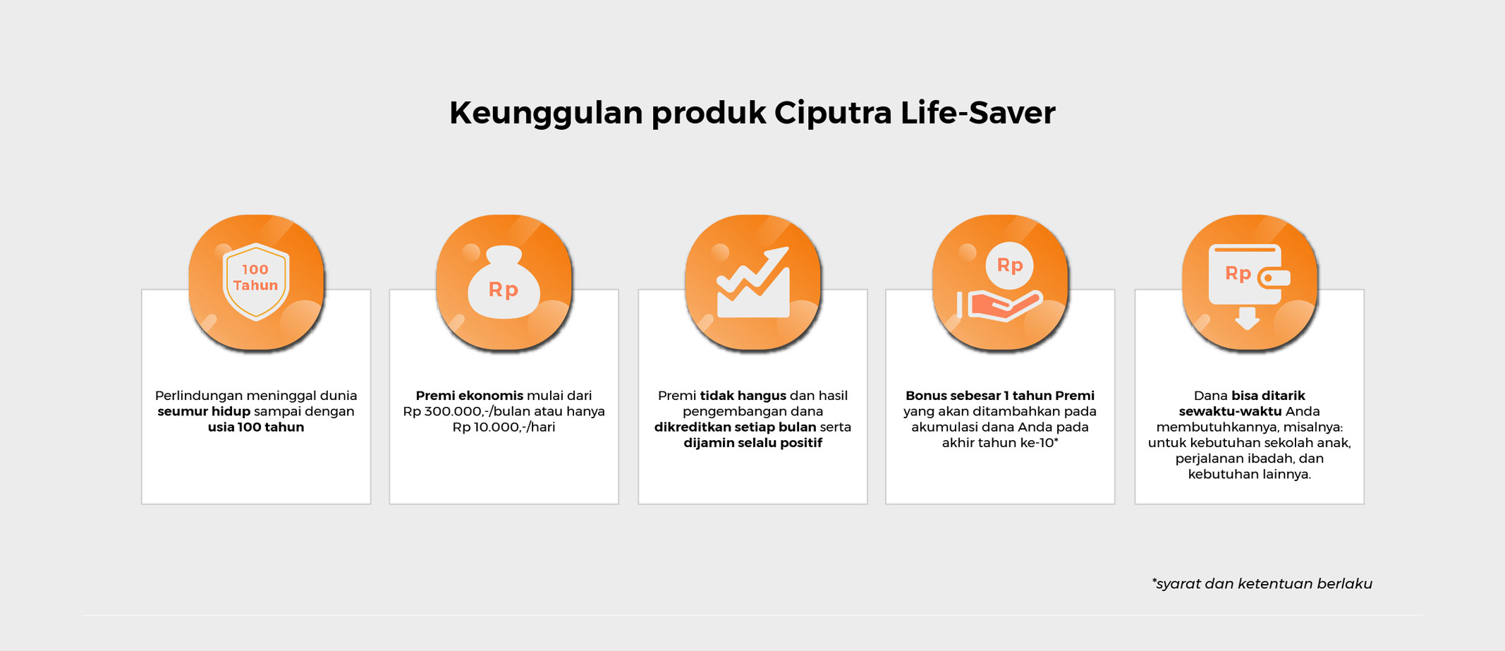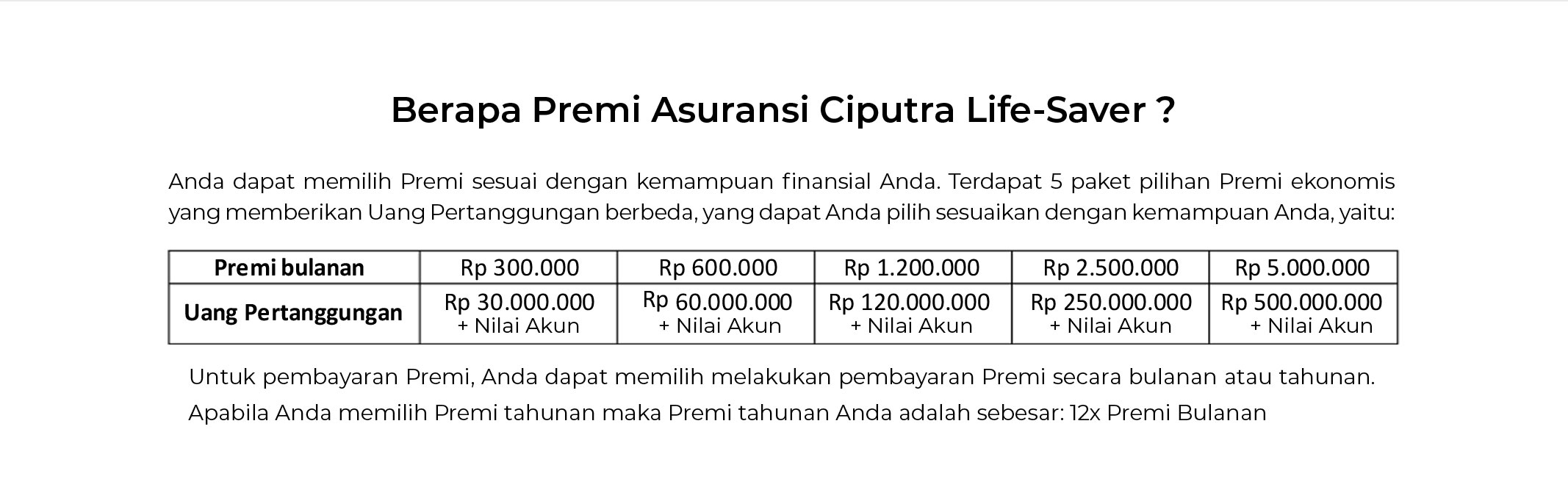 Tersedia 5 (lima) paket pilihan premi Ciputra Life-Saver yang dapat Anda bayarkan secara bulanan atau tahunan:
