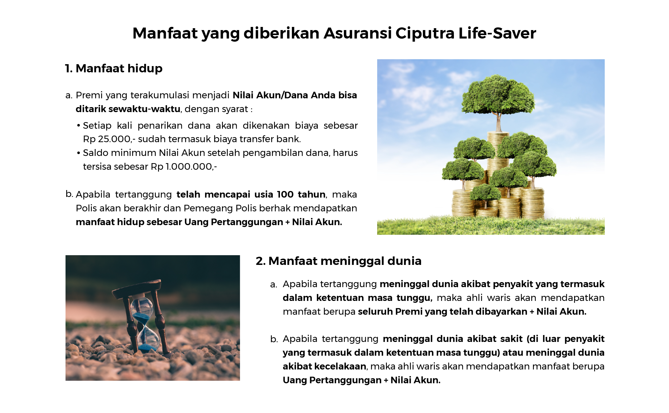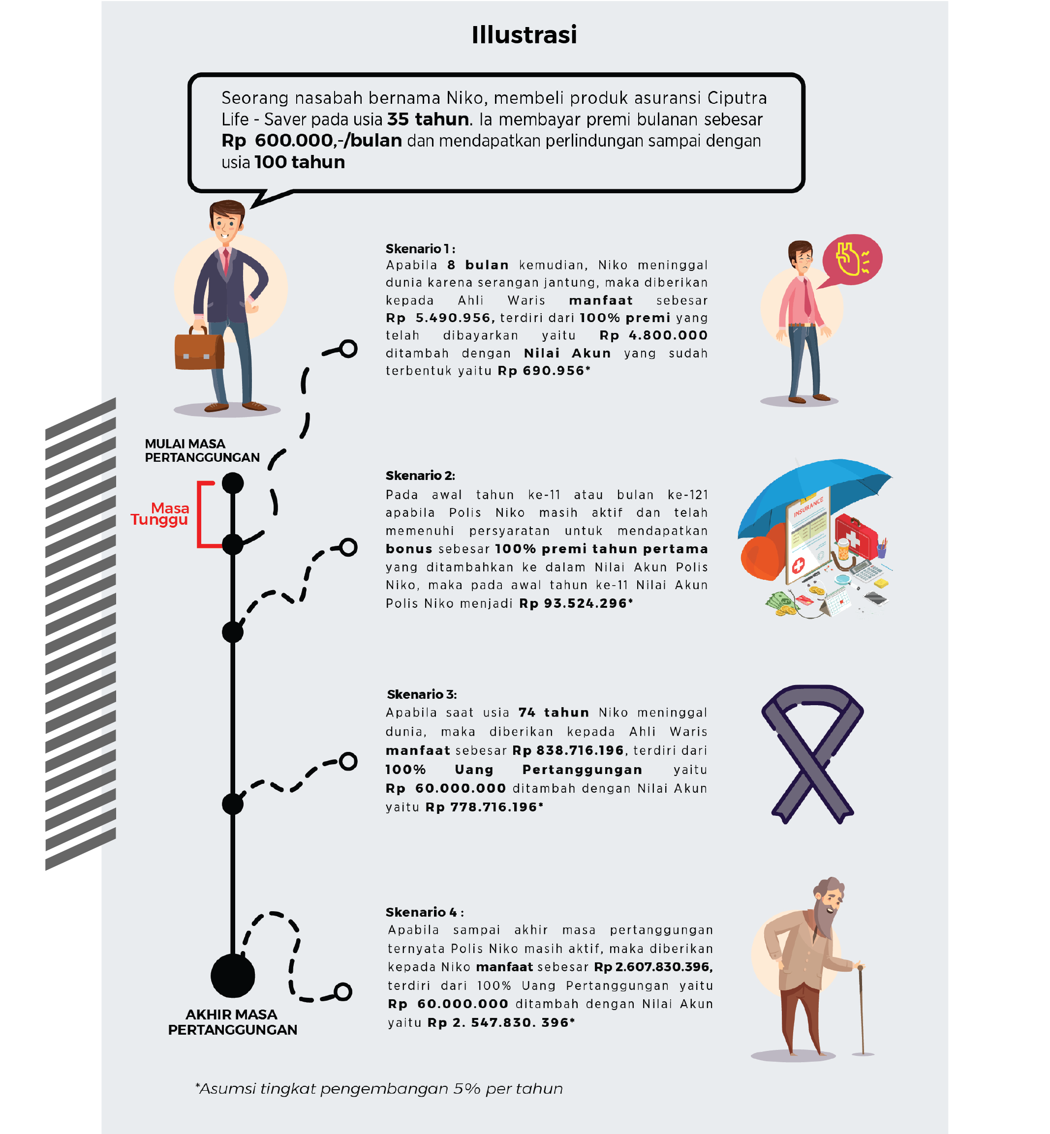 Asuransi Ciputra Life-Saver memberikan jaminan Tingkat Pengembangan Minimum Nilai Akun selalu positif (>= 0% per tahun net setelah pajak) dan Tingkat Pengembangan Minimum Nilai Akun untuk tahun berjalan akan diumumkan pada setiap awal tahun.