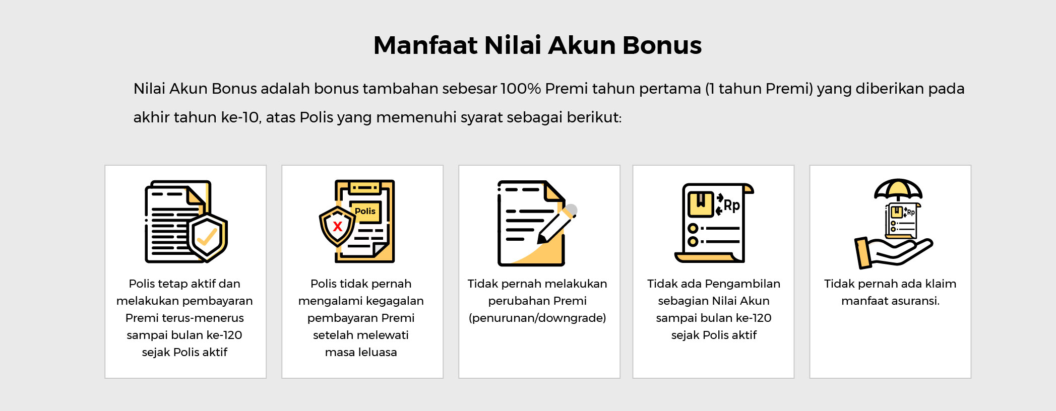 Nilai Akun Bonus adalah tambahan terhadap Nilai Akun, yang besarnya 100% (seratus persen) dari Premi tahun pertama, yang akan diberikan satu kali oleh Penanggung pada bulan ke 121 sejak Polis Aktif, setelah seluruh syarat-syarat dibawah ini terpenuhi: