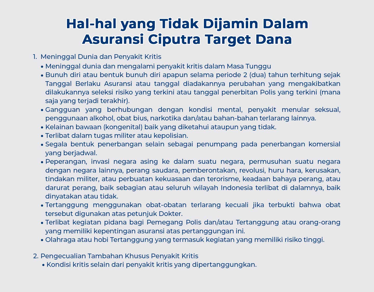 Seluruh Warga Negara Indonesia (WNI) yang berusia 17 – 65 tahun berhak membeli dan menjadi Pemegang Polis Asuransi Ciputra Target Dana sekaligus menjadi Tertanggung.