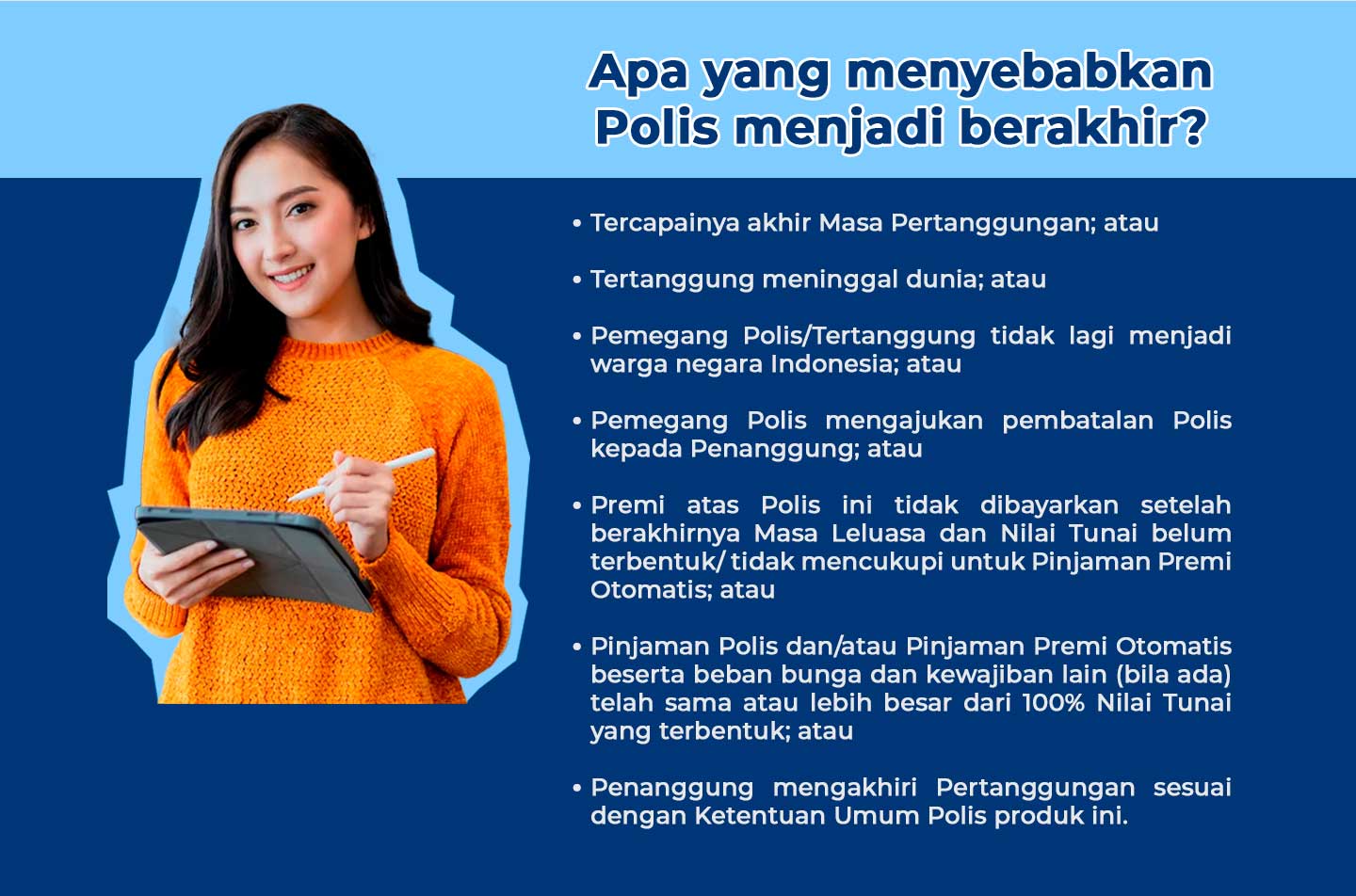 Polis yang telah berakhir, dapat diaktifkan kembali maksimum 3 (tiga) bulan sejak tanggal polis lapse. Pengaktifkan Polis kembali diperbolehkan maksimum 1 x selama Masa Pertanggungan.